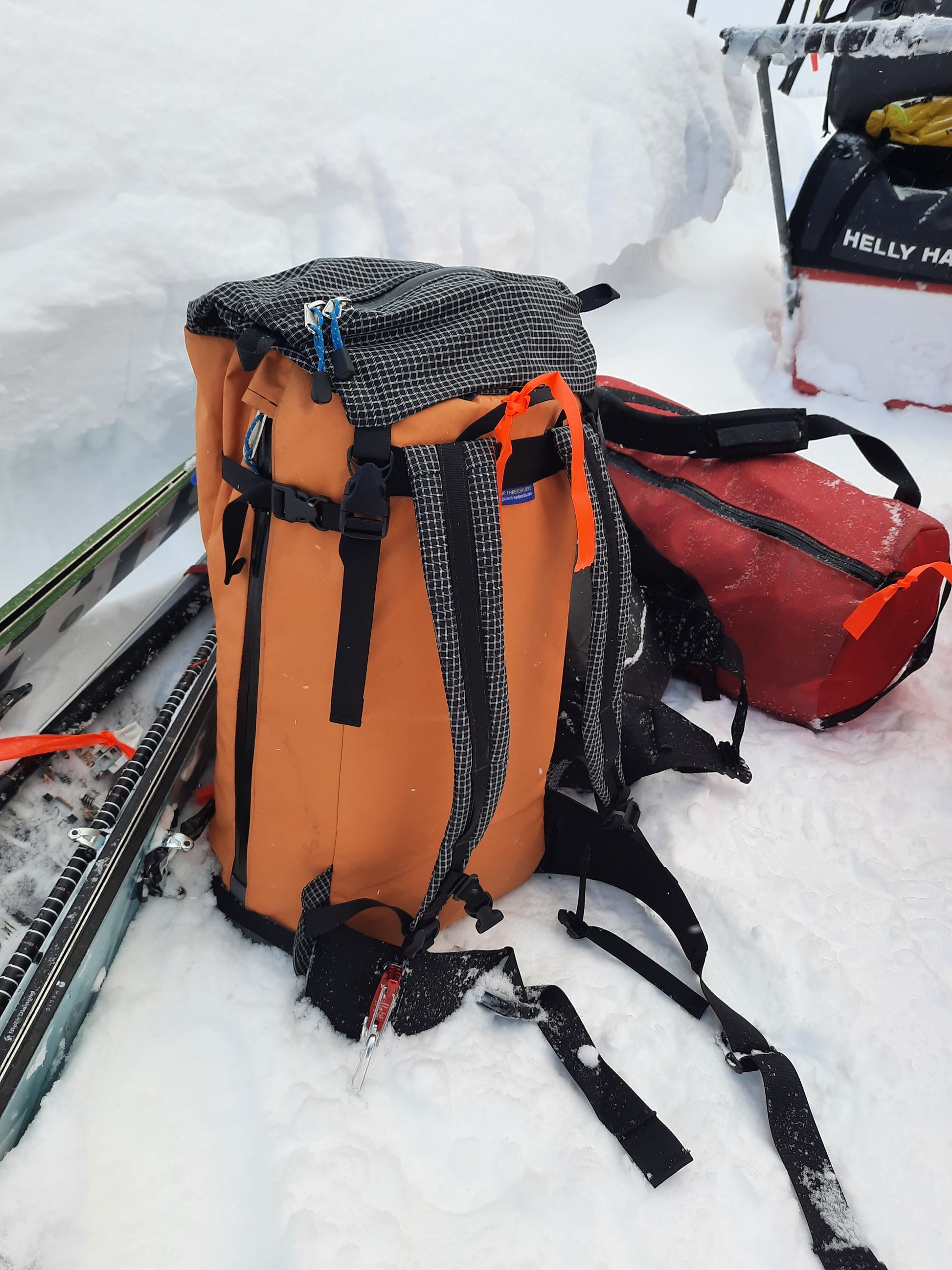 Fabric: Main fabric is Challenge Sailbloth's EPLX600 Cordura (the rusty orange colour). The premium, hydrophobic, Ultra400 TX Dyneema is also offered as a $100 upgrade. The lid and other lighter weight items on the pack is the recycled nylon/dyneema ripstop Ultra grid